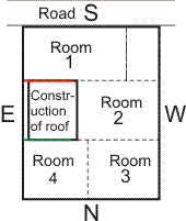In the figure shown, construction is on SouthWest wall. Rooms on the lower floors are shown in dotted lines. The influence of construction on the roof on Each room as under: