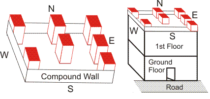 Constructions adjoining compound wall or parapet may be done towards South & West as shown away from the corner.