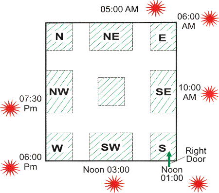 Morning 6:00 am sun will be in East direction. In this direction stair case, loft, shelf, almirah, and on the terrace stair case cover, water tank, toilet, room etc. are vastu defects. Consequences are serious ailments among men folk, insecurity feeling, loss of name & fame, financial stringency, court cases problems with administration, being child less or abortions etc.