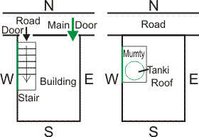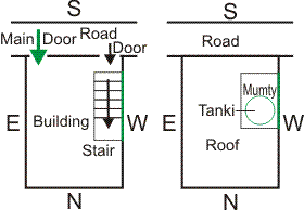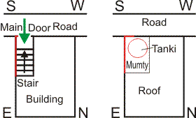 Road is towards NorthWest of the construction. Main door is in the exalted position of North. Stair case and stair case cover are also in the same side. This has adverse effect. financial stringency, female folk being unwell, irritable temper and loss of name and fame.