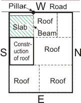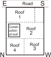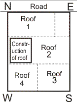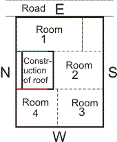 In the figure shown, construction is towards West on the roof. This is correct for the whole building. Rooms on the lower floors are shown in dotted lines. The influence of construction on the roof on Each room as under: