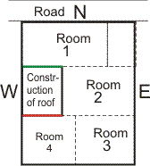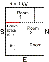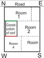 In the figure shown, construction is on SouthWest wall. Rooms on the lower floors are shown in dotted lines. The influence of construction on the roof on Each room as under: