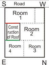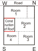 Room 1: The roof construction is on SouthEast wall of this room. Consequences are - female folk being unwell, indebtedness, disputes & fight, mental worries, problems with administration, fire & theft hazards. If a couple live in this place, their second child would have troublesome life. Room 2 : The construction on roof is towards SouthWest of this room, causing increased weigh on SouthWest wall. This is benevolent. Room 3 : The construction is away from this room, It has no effect. Room 4 : The construction on this room is on the NorthWest wall. Consequences are - female folk being unwell, indebtedness, disputes & fight, mental worries, insolvency, problems with administration. If a couple live in this place, their third third child would have troublesome life.